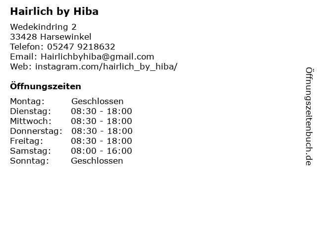 | Öffnungszeiten Hairlich by Hiba in Harsewinkel anzeigen | |