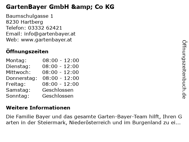 | Öffnungszeiten GartenBayer GmbH & Co KG in Hartberg anzeigen | |