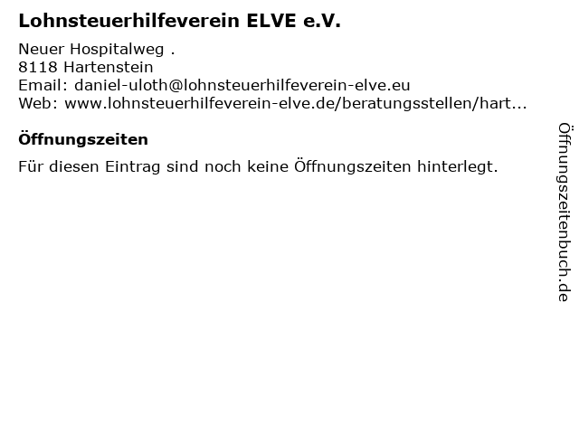 | Öffnungszeiten Lohnsteuerhilfeverein ELVE e.V. in Hartenstein anzeigen | |