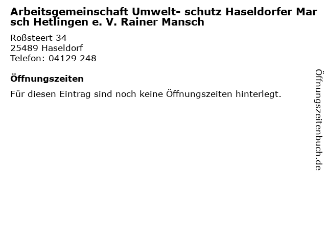 | Arbeitsgemeinschaft Umwelt- schutz Haseldorfer Marsch Hetlingen e. V. Rainer Mansch anrufen | |