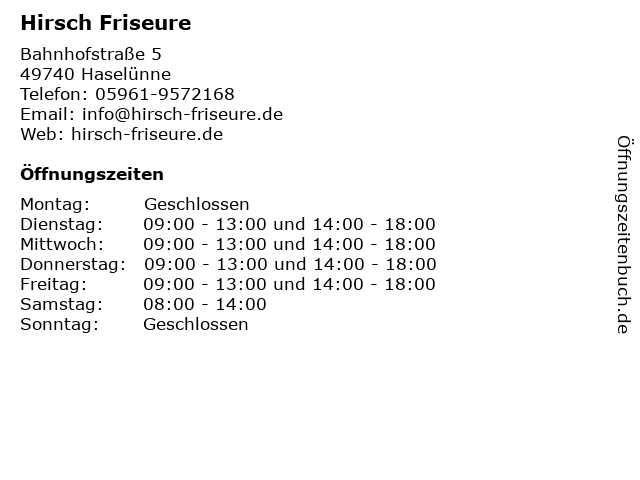 | Öffnungszeiten Hirsch Friseure in Haselünne anzeigen | |