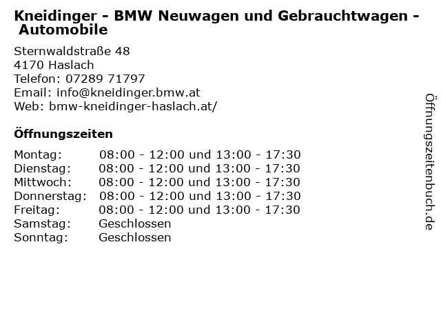 1 Kneidinger - BMW Neuwagen und Gebrauchtwagen - Serviceannahme (Entfernung: 0,00 km) Sternwaldstraße 48, 4170 Haslach 2 Kneidinger - BMW Neuwagen und Gebrauchtwagen - Werkstätte, Teile & Zubehör (Entfernung: 0,00 km) Sternwaldstraße 48, 4170 Haslach 6 |