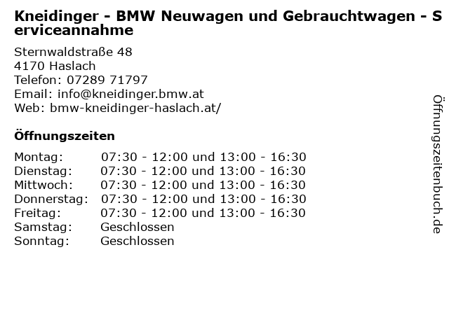 1 Kneidinger - BMW Neuwagen und Gebrauchtwagen - Werkstätte, Teile & Zubehör (Entfernung: 0,00 km) Sternwaldstraße 48, 4170 Haslach 2 Kneidinger - BMW Neuwagen und Gebrauchtwagen - Automobile (Entfernung: 0,00 km) Sternwaldstraße 48, 4170 Haslach 6 |
