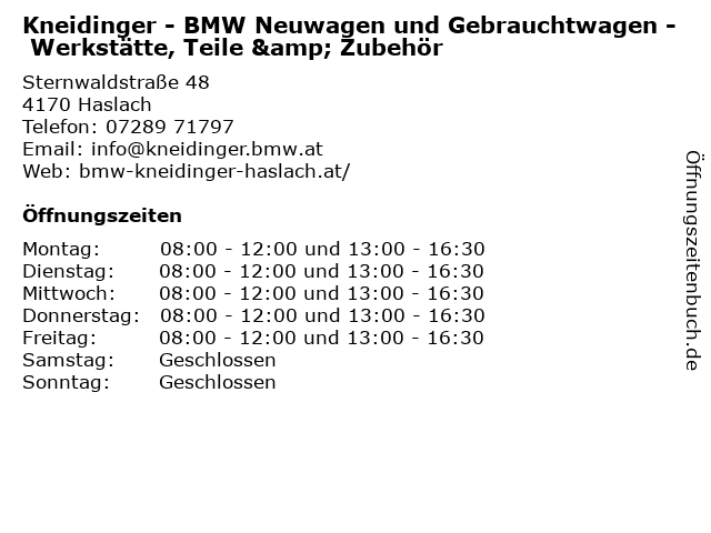 1 Kneidinger - BMW Neuwagen und Gebrauchtwagen - Serviceannahme (Entfernung: 0,00 km) Sternwaldstraße 48, 4170 Haslach 2 Kneidinger - BMW Neuwagen und Gebrauchtwagen - Automobile (Entfernung: 0,00 km) Sternwaldstraße 48, 4170 Haslach 6 Lagerhausgenossenschaft Rohrbach eGen. - Werkstätte PKW, PKW-Handel und Ersatzteile (Entfernung: 4,76 km) Bahnhofstraße 47, 4150 Rohrbach |