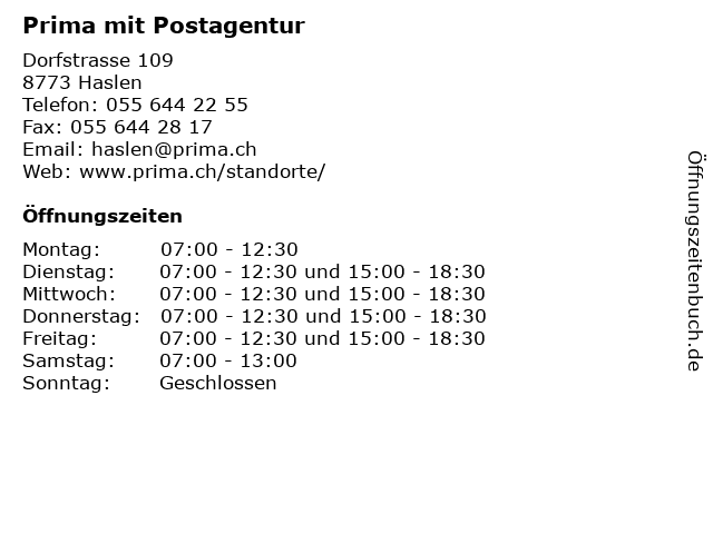 | Öffnungszeiten Prima mit Postagentur in Haslen anzeigen | |