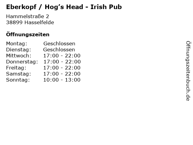 | Öffnungszeiten Eberkopf / Hog’s Head - Irish Pub in Hasselfelde anzeigen | |