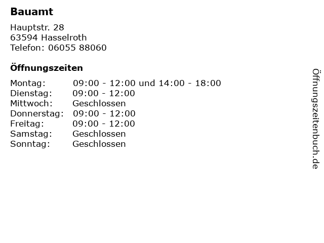 | Öffnungszeiten Bauamt in Hasselroth anzeigen | |