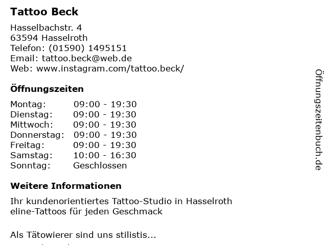| Öffnungszeiten Tattoo Beck in Hasselroth anzeigen | |