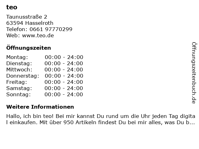 | Öffnungszeiten teo in Hasselroth anzeigen | |