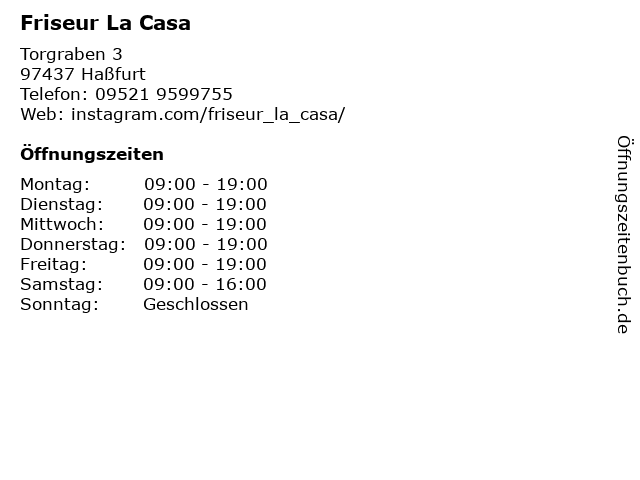| Öffnungszeiten Friseur La Casa in Haßfurt anzeigen | |