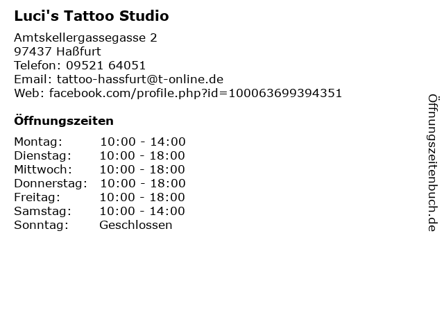 | Öffnungszeiten Luci's Tattoo Studio in Haßfurt anzeigen | |