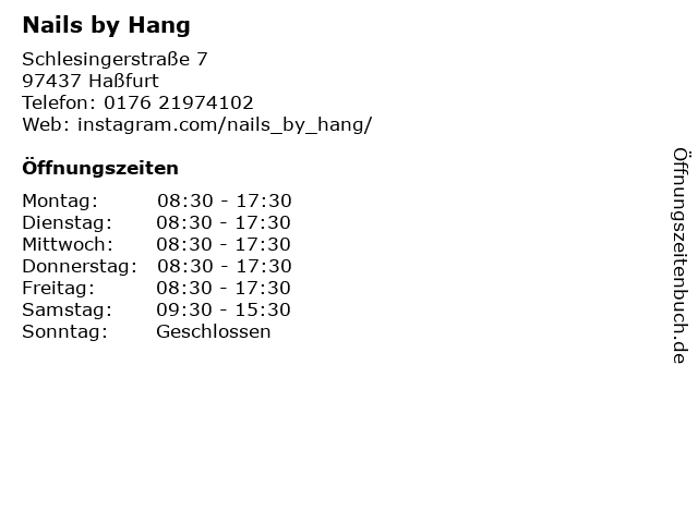| Öffnungszeiten Nails by Hang in Haßfurt anzeigen | |
