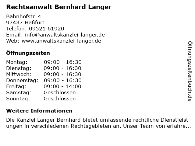 | Öffnungszeiten Rechtsanwalt Bernhard Langer in Haßfurt anzeigen | |