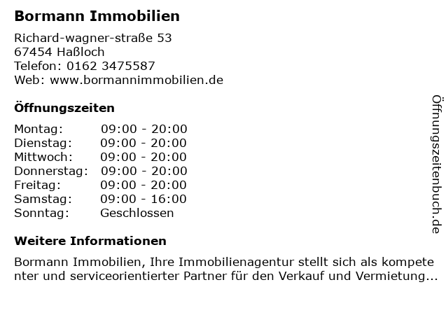 | Öffnungszeiten Bormann Immobilien in Haßloch anzeigen | |