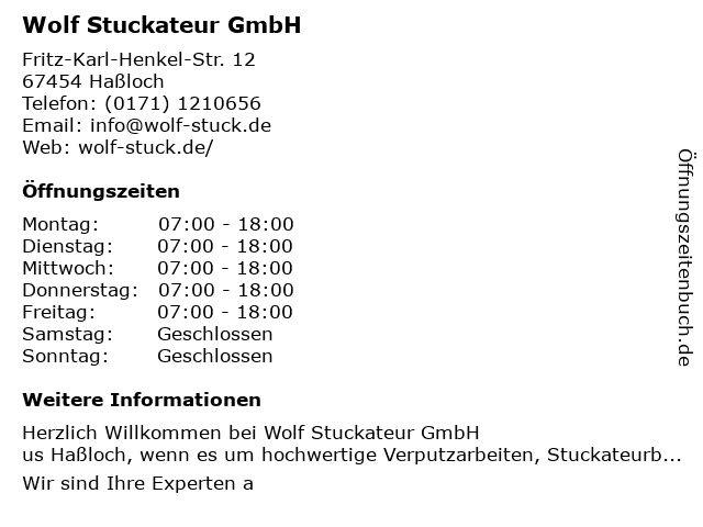 | Öffnungszeiten Wolf Stuckateur GmbH in Haßloch anzeigen | |
