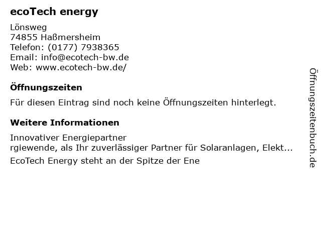 | Öffnungszeiten ecoTech energy in Haßmersheim anzeigen | |