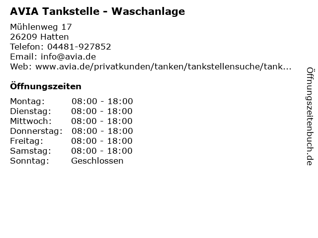 | Öffnungszeiten AVIA Tankstelle - Waschanlage in Hatten anzeigen | |