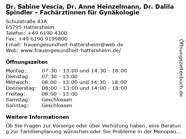 1 Dr.med. Sabine Vescia Fachärztin für Frauenheilkunde und Geburtshilfe (Entfernung: 0,04 km) Schulstr. 43a, 65795 Hattersheim 5 Sabine Vescia Fachärztin für Frauenheilkunde und Geburtshilfe (Entfernung: 14,85 km) Kaiserstr. 5, 60311 Frankfurt 6 |