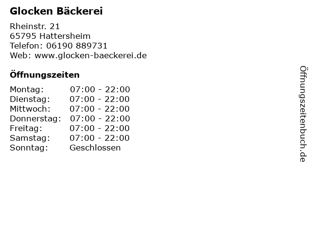 | Öffnungszeiten Glocken Bäckerei in Hattersheim anzeigen | |