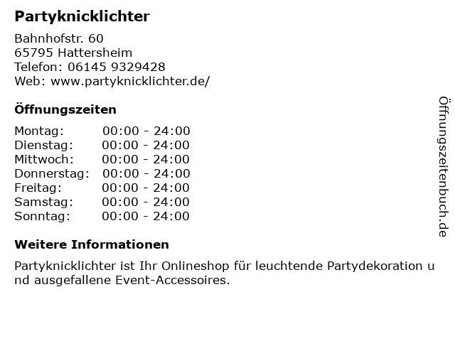 | Öffnungszeiten Partyknicklichter in Hattersheim anzeigen | |