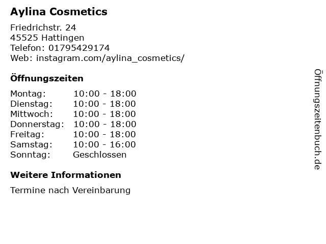 | Öffnungszeiten Aylina Cosmetics in Hattingen anzeigen | |