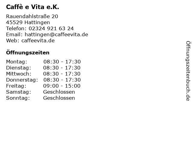 | Öffnungszeiten Caffè e Vita e.K. in Hattingen anzeigen | |