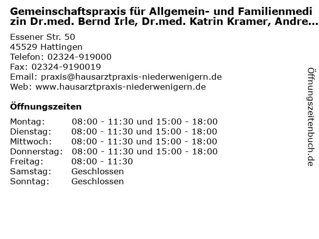 1 Gemeinschaftspraxis für Allgemeinmedizin Ulrike Giebner und Dr.med. Martina Muer (Entfernung: 3,09 km) Denkmalstraße 6, 45529 Hattingen 3 Gemeinschaftspraxis Dr. med. dent. Torsten Weist &Dr. med. dent. Fabian Schulz (Entfernung: 3,54 km) Bruchstraße 32, 45525 Hattingen 4 Überörtliche HNO-Gemeinschaftspraxis - Dr. med. J. Blobel und Dr. med. J. Schekelmann (Entfernung: 3,55 km) Augustastr. 25, 45525 Hattingen 5 Dr. med. Harald Schumann Petra Miklis, Allgemein/ Internist-GbR (Entfernung: 3,59 km) Kupferdreher Str. 154, 45257 Essen 6 Dr. med. Nina Brockhaus und Sabine Backendorf Gemeinschaftspraxis für Kinder- und Jugendmedizin (Entfernung: 3,84 km) Moltkestr. 4, 45525 Hattingen |