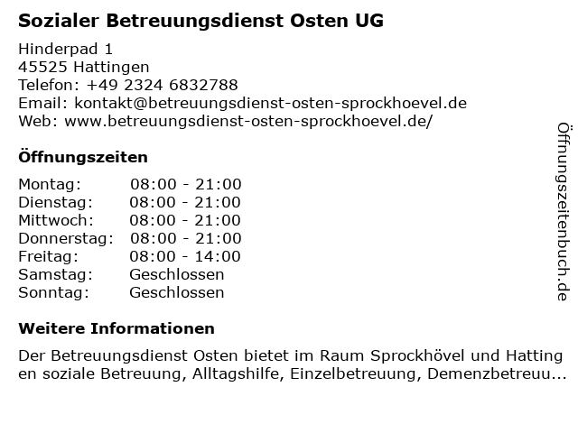 Branchen & Suchbegriffe zu Sozialer Betreuungsdienst Osten UG:alltagshilfe, ambulante betreuung, angehörigen entlastung, ausflüge, begleitung behördengänge, beratung im alltag, betreuung hattingen, betreuung sprockhövel, betreuungsdienst, betreuungsdienst osten, demenzbetreuung, einzelbetreuung, freizeitgestaltung, gedächtnistraining, haushaltshilfe, hauswirtschaft, hygiene- und wellnessmaßnahmen, osten, pflegebegleitung, soziale betreuung, sozialer, ug, unterstützung im alltag, verhinderungspflege |
