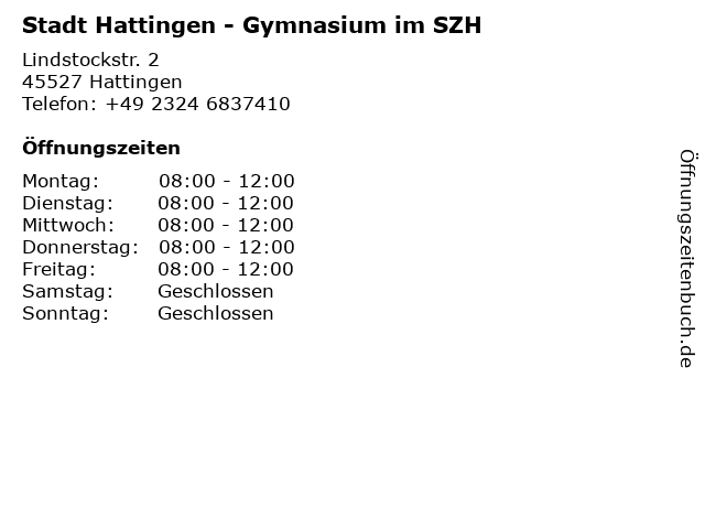 1 Stadt Hattingen - Marie-Curie-Realschule im SZH (Entfernung: 0,03 km) Lindstockstr. 2, 45527 Hattingen 4 Städt. Gymnasium Nikolaus-Ehlen-Gymnasium (Entfernung: 13,01 km) Friedrich-Ebert-Str. 81, 42549 Velbert 6 |