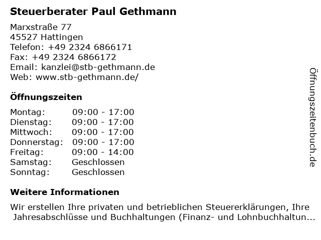 Steuerberater Paul Gethmann in Hattingen: Telefonnummer, Öffnungszeiten und Adresse