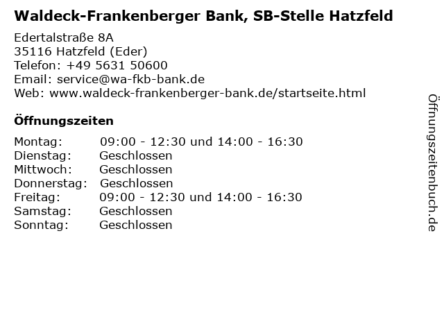 Branchen & Suchbegriffe zu Waldeck-Frankenberger Bank, SB-Stelle Hatzfeld:bank, bausparen, beratung, festgeld, frankenberger, geldautomat, genossenschaft, immobilien, kredit, sb, stelle, tagesgeld, versicherung |