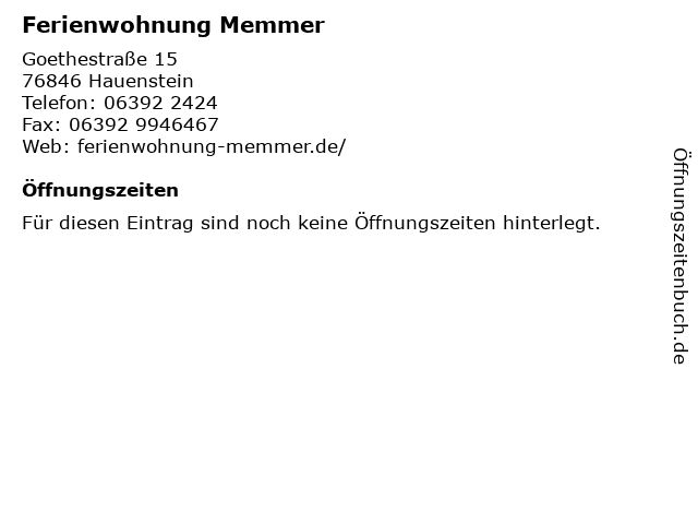 | Öffnungszeiten Ferienwohnung Memmer in Hauenstein anzeigen | |