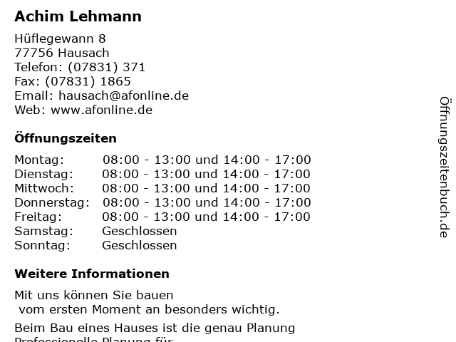 | Öffnungszeiten Achim Lehmann in Hausach anzeigen | |