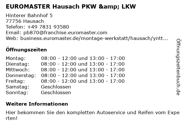 | Öffnungszeiten EUROMASTER Hausach PKW & LKW in Hausach anzeigen | |