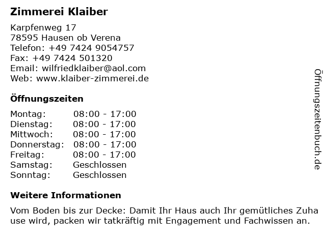 | Öffnungszeiten Zimmerei Klaiber in Hausen ob Verena anzeigen | |