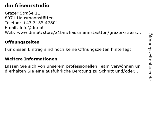 | Öffnungszeiten dm friseurstudio in Hausmannstätten anzeigen | |