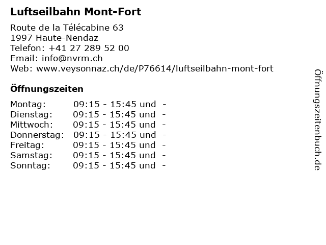 | Öffnungszeiten Luftseilbahn Mont-Fort in Haute-Nendaz anzeigen | |