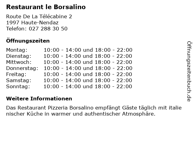 | Öffnungszeiten Restaurant le Borsalino in Haute-Nendaz anzeigen | |