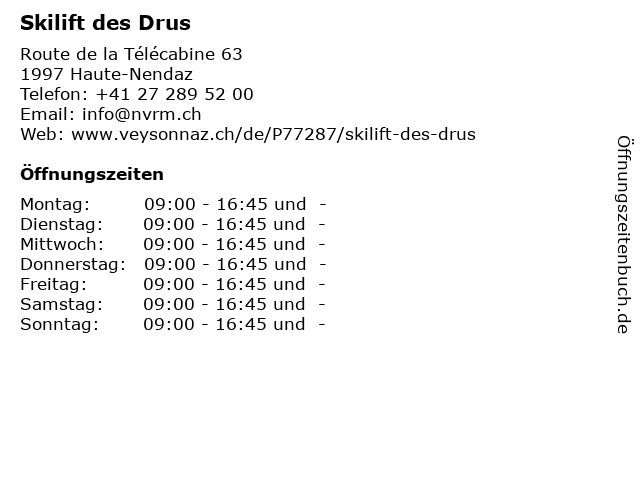 | Öffnungszeiten Skilift des Drus in Haute-Nendaz anzeigen | |