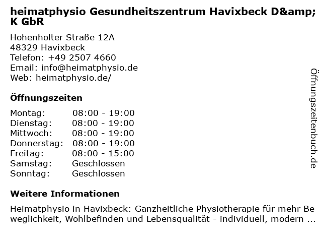 Branchen & Suchbegriffe zu heimatphysio Gesundheitszentrum Havixbeck D&K GbR:alltagstaugliche therapie, beweglichkeit, bewegungsförderung, d&k, ganzheitliche therapie, gbr, gesundheitszentrum, hausbesuche, havixbeck, heimatphysio, kiefergelenksbehandlung, krankengymnastik, manuelle therapie, medizinisches gerätetraining, neurologische physiotherapie, physiotherapie, prävention, rehabilitation, schmerztherapie, therapie in havixbeck, therapieangebot |