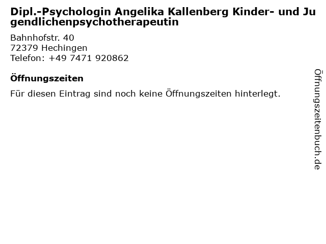 | Dipl.-Psychologin Angelika Kallenberg Kinder- und Jugendlichenpsychotherapeutin anrufen | |