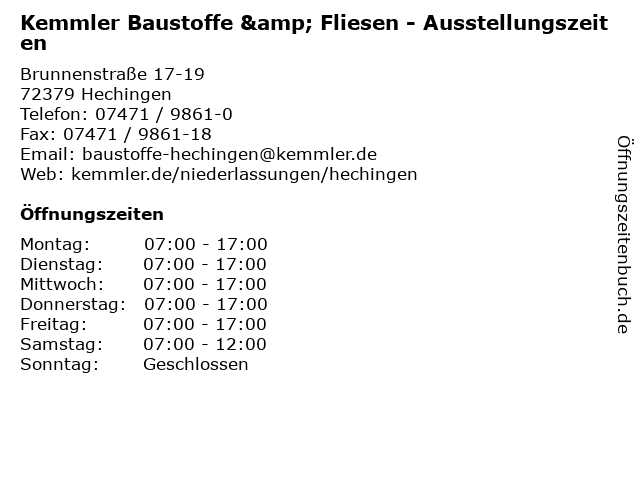 1 Kemmler Baustoffe & Fliesen - Ausstellungszeiten (Entfernung: 14,66 km) Lange Straße 18, 72336 Balingen 2 Kemmler Baustoffe & Fliesen - Verkaufszeiten (Entfernung: 0,00 km) Brunnenstraße 17-19, 72379 Hechingen 6 |