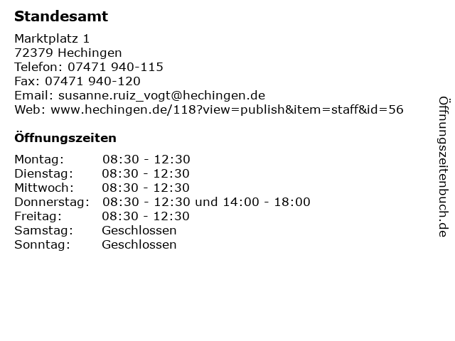 | Öffnungszeiten Standesamt in Hechingen anzeigen | |