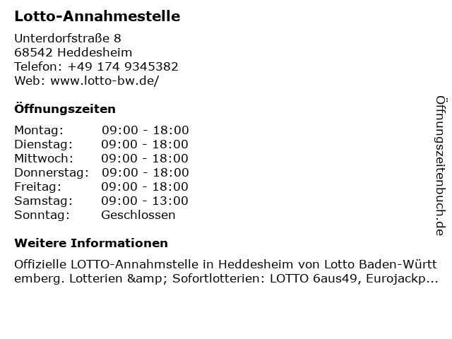 | Öffnungszeiten Lotto-Annahmestelle in Heddesheim anzeigen | |