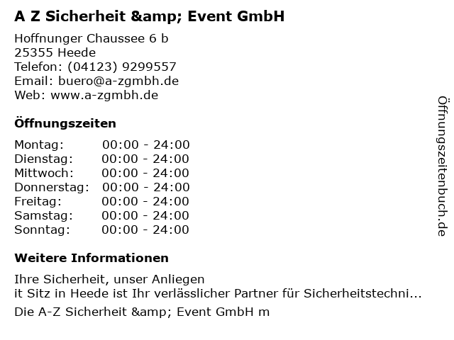 | Öffnungszeiten A Z Sicherheit & Event GmbH in Heede anzeigen | |