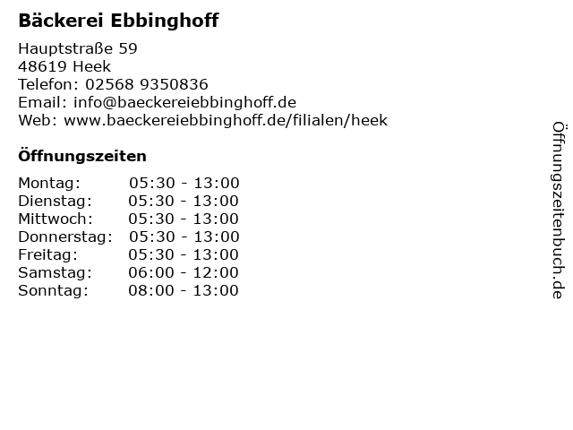 | Öffnungszeiten Bäckerei Ebbinghoff in Heek anzeigen | |