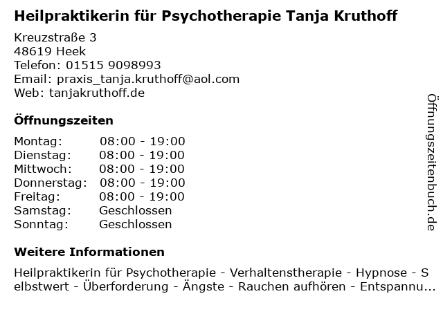 Branchen & Suchbegriffe zu Heilpraktikerin für Psychotherapie Tanja Kruthoff:heilpraktikerin, hypnosetherapie, kruthoff, psychotherapie, tanja |