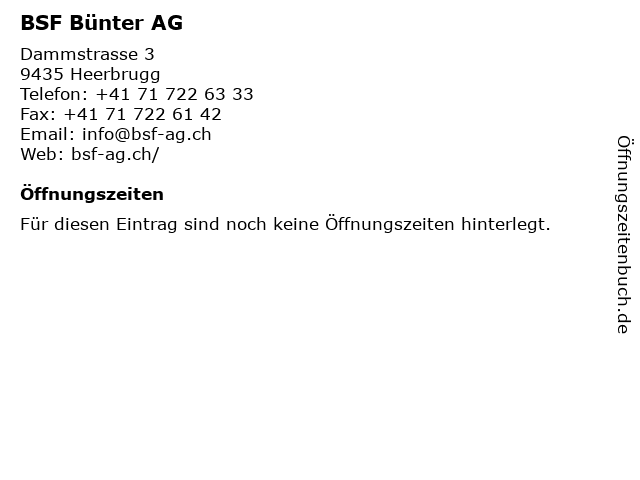 | Öffnungszeiten BSF Bünter AG in Heerbrugg anzeigen | |