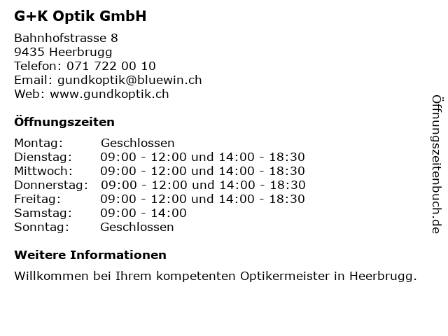 | Öffnungszeiten G+K Optik GmbH in Heerbrugg anzeigen | |