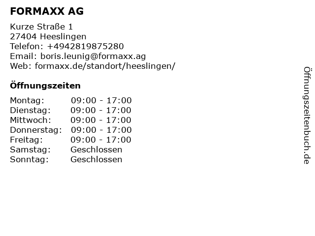 | Öffnungszeiten FORMAXX AG in Heeslingen anzeigen | |